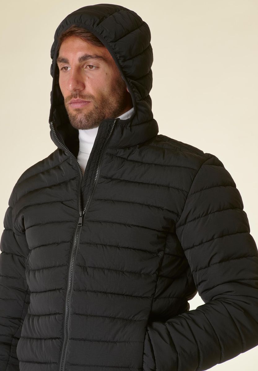Piumino nero cappuccio 100gr. Trapuntato. Il capo ha bordi con elastico,cappuccio astronauta,tasche laterali inserite zon zip, Tessuto goffrato, imbottitura eco-piuma.