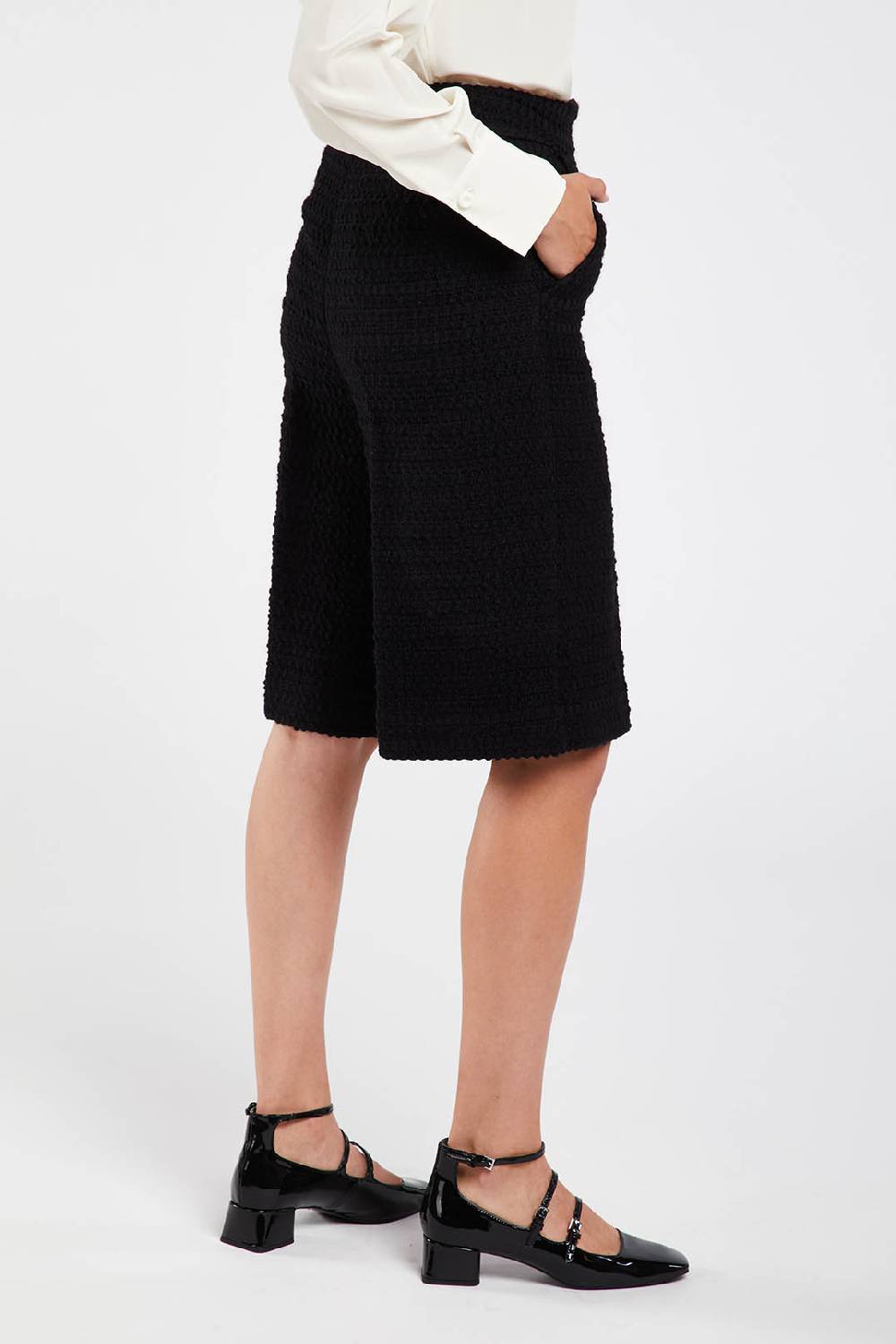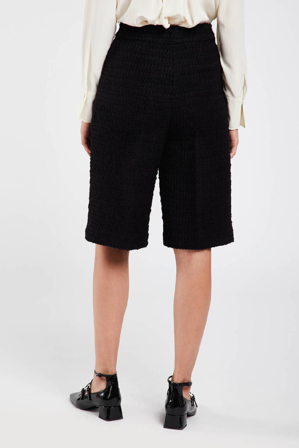 Tonal tweed bermuda trousers, slightly flared leg, knee length.
