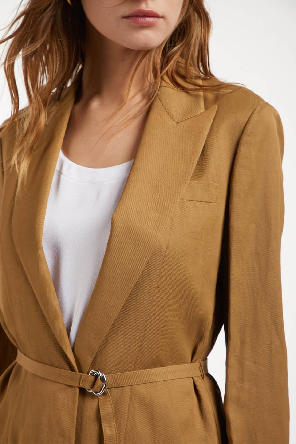 Viscose linen tricotine long jacket, peak lapels, waist belt and welt pocket.