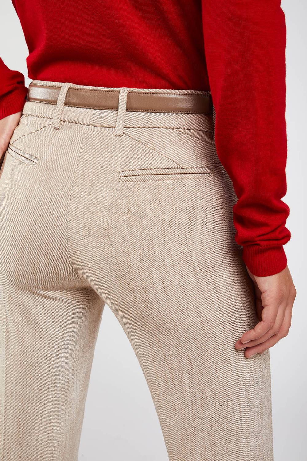 Woven diagonal gabardine trousers, straight leg, french pockets, waistband with loops and front opening.