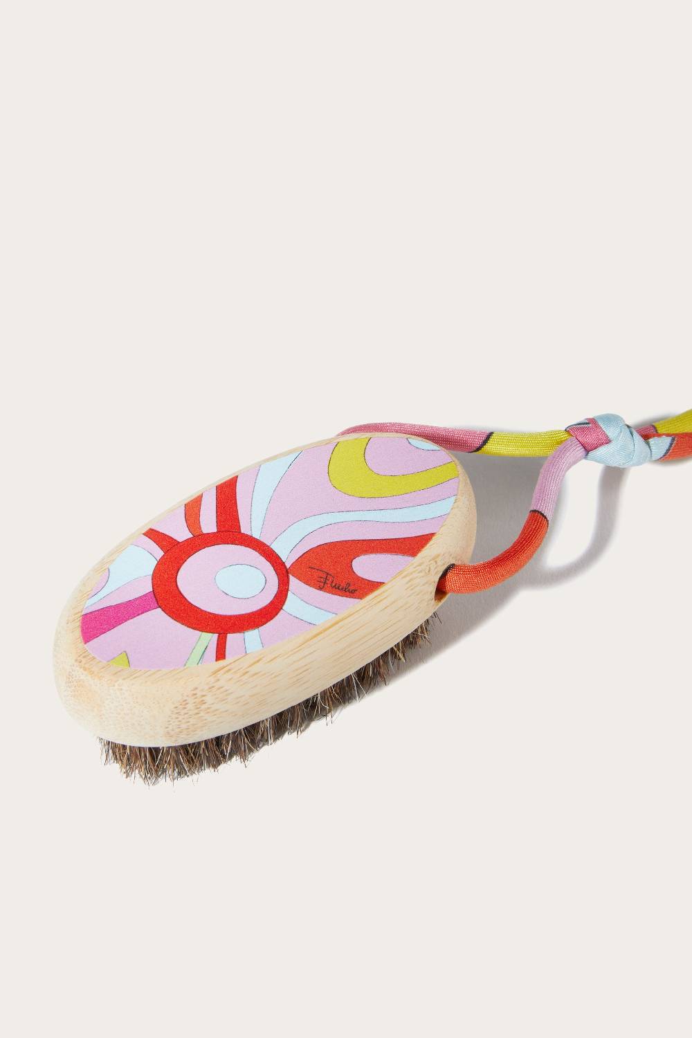 Il linguaggio stilistico di Pucci si fonde a una nuova linea di articoli lifestyle, come questa spazzola per unghie in legno di faggio. Decorato lateralmente da una versione pastello della stampa Marmo, l'accessorio è completato dal lettering della maison.