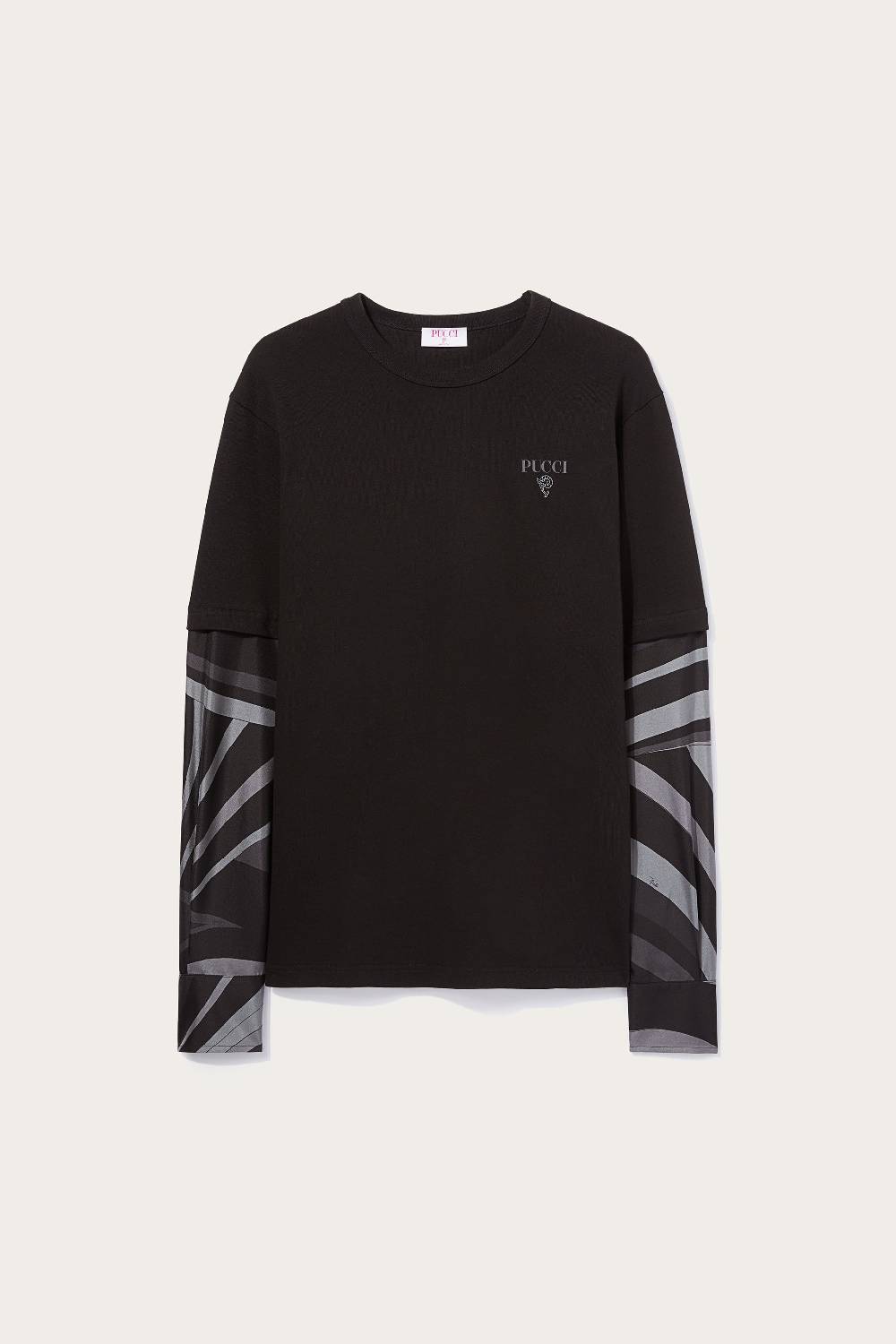 Camille Miceli gioca con i design tradizionali aggiungendovi un twist contemporaneo. Questo modello ibrido crea l'illusione di una T-shirt nera in cotone sovrapposta a una camicia, con maniche attraversate dalla stampa Iride e polsini con bottone tipici dei modelli più classici.