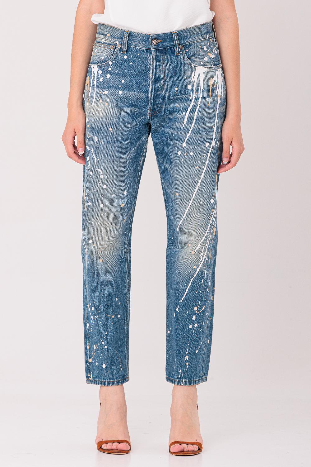 Pantalone con lavaggio denim scuro, presenta lavorazione schizzi a mano libera di colore bianco e oro.