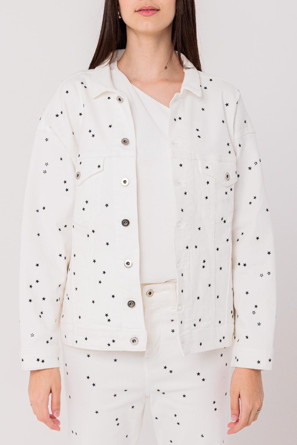 Giacca bianca con microstelle a borchia nere su fronte e retro.
