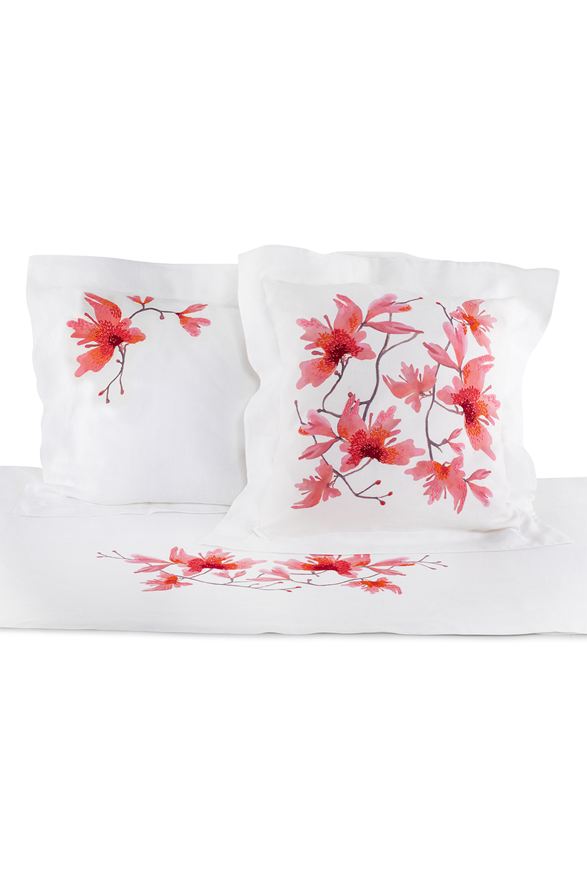 Un set per il letto composto da un lenzuolo e due cuscini con bordo. La stampa ricamata con un motivo floreale floreale impreziosisce un prodotto in candido lino, che dona al set una sensazione di freschezza e morbidezza al tatto.