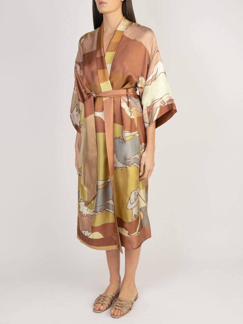 Un kimono in pura seta, lo strumento della seduzione per eccellenza. Un capo che ci dona le sue origini dagli abiti dell’antico giappone, trasformandosi in una vestaglia contemporanea, da lasciare morbida sui fianchi o da legare dolcemente in vita per fasciare le curve senza stringerle.